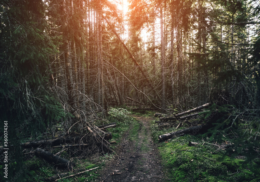 Forest road under Tall spruce-trees, slope of the hill covered by orange earth under overcast sky. Fir forest with high trees in Carpathian mountains, Europe. Travel background