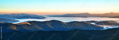 Beautiful dawn in the mountain range. Mountains shrouded in mist in a scenic landscape view. Location Carpathian mountains, Europe. Travel background
