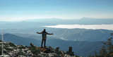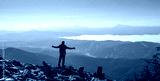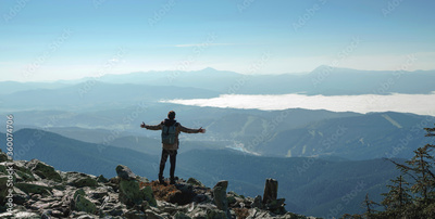 Happy hiker winning reaching life goal, success, freedom and happiness, achievement in mountains. Lifestyle wanderlust adventure. Carpathian mountains, Ukraine, Europe