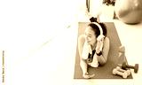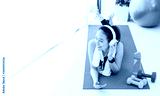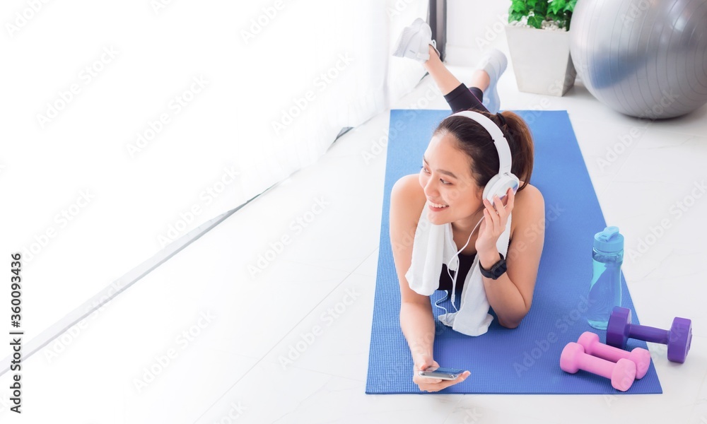 Asian woman listening to music with headphone and smartphone after play yoga and exercise at home background with copy space.Exercise for Lose weight, increase flexibility And tighten the shape.
