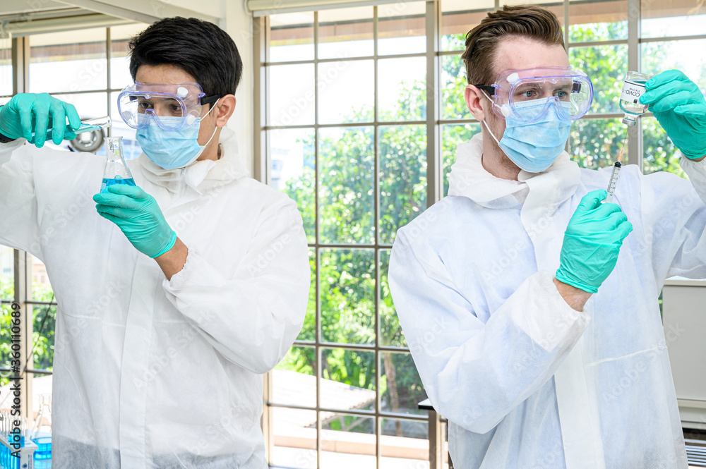 Couple male scientist wearing protection suit holding Coronavirus vaccine and working with many lab equipment for research vaccine at laboratory.