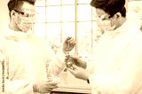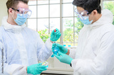 Couple male scientist wearing protection suit holding beaker or tube with sample liquid inside and working with many lab equipment for research at laboratory.