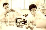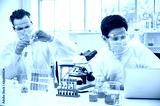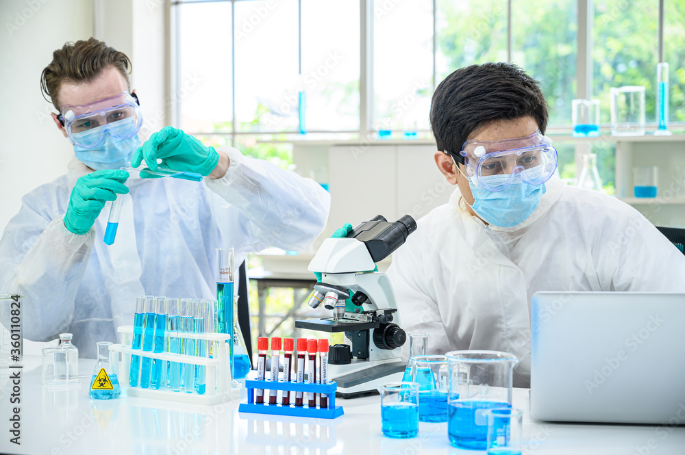 Couple male scientist wearing protection suit working with Microscope and computer laptop and many lab equipment for research Coronavirus vaccine at laboratory.