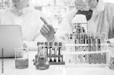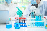 Lab equipment with blue liquid inside stand on the table with couple male scientist wearing protection suit at laboratory at the background.
