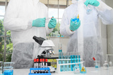 Lab equipment with blue liquid inside stand on the table with couple male scientist wearing protection suit holding Coronavirus vaccine for research at laboratory at the background.