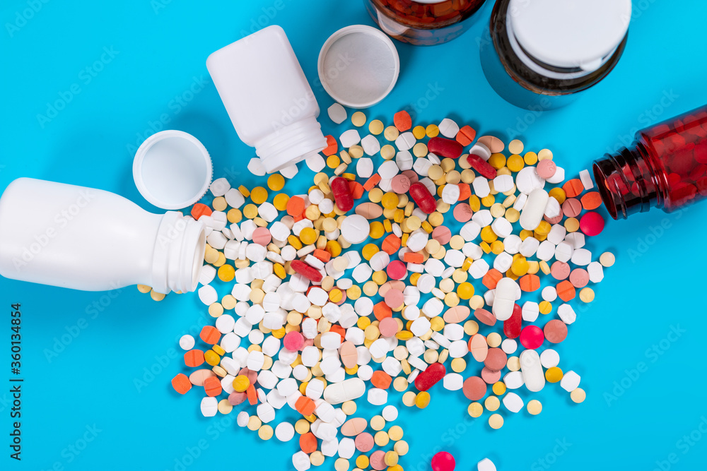 Medical pills and tablets spilling out of a drug bottle on blue background