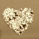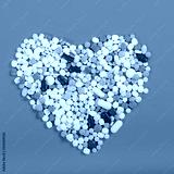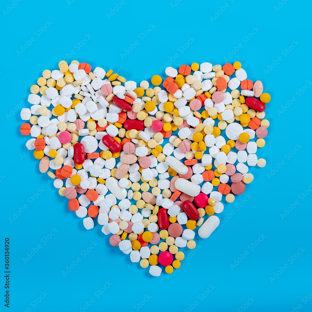 Many pills in the form of a heart Multicolored on a blue background