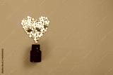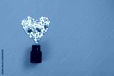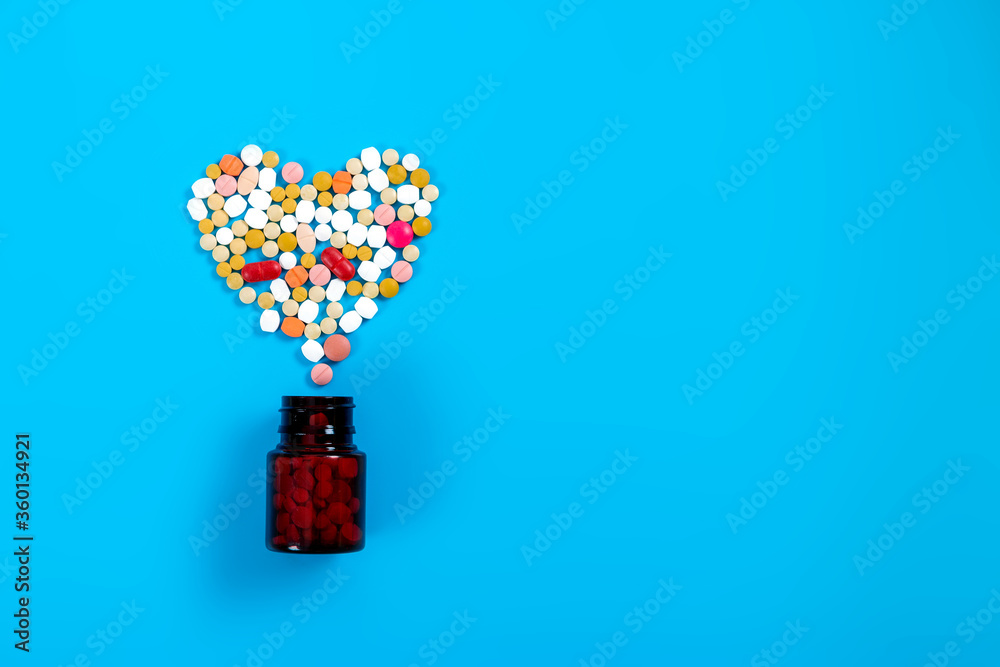 Assorted pharmaceutical medicine pills, tablets for the treatment of heart disease. Heart shape and bottle of pills. Copy space for text