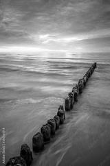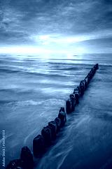 Seascape with an old wooden breakwater at sunset, long exposure picture.