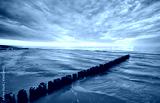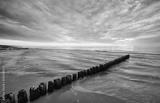 Seascape with an old wooden breakwater at sunset.