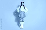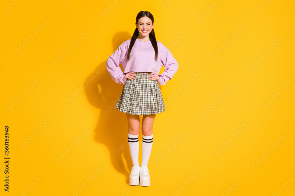 Full size photo of attractive content youth girl put hands waist enjoy spring fall weekends wear good look jumper isolated over shine color background
