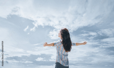 Happy young woman standing with raised arms in front of cloudy sky in summer.