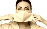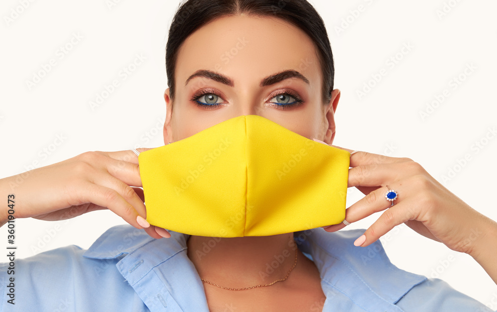 New normal concept. Woman in casual outfit during quarantine of coronavirus outbreak. Model tries on a yellow protective handmade antiviral face mask on white background.