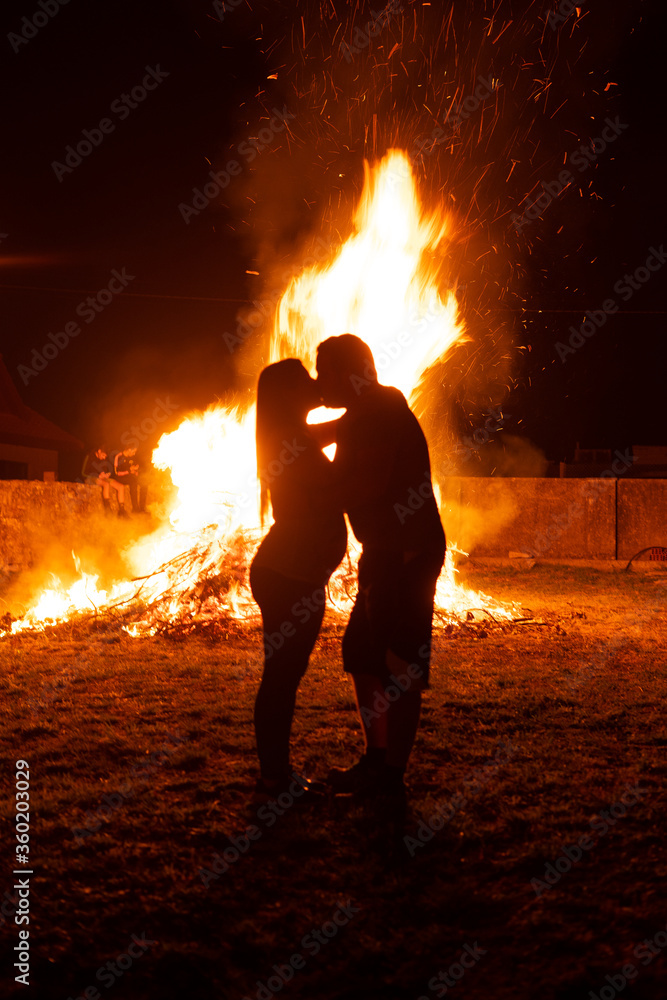 Pregnant couple in front of a giant fire