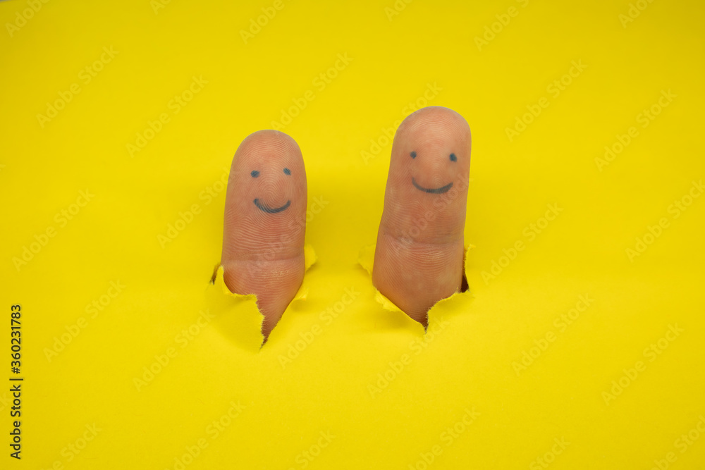 Human fingers with smiling faces tearing yellow paper and pretending to talk with each other then disappearing
