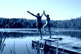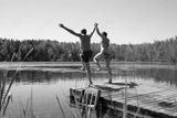 Man and woman jump to lake water together having fun