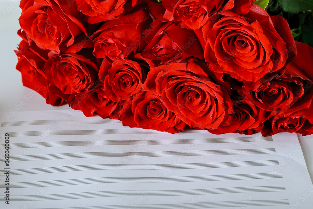 Bouquet of red roses on a sheet for musical notes. copy space.
