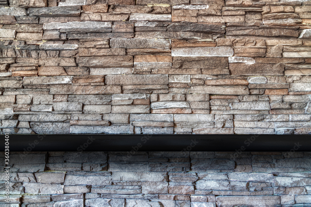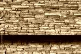 Stone Brick Wall Background With Empty Wooden Shelf And Copy Space