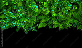 Rośliny wyizolowane na czarnym tle. Paproć, olsza, trawy, kwiaty niezapominajek, liście klonu.