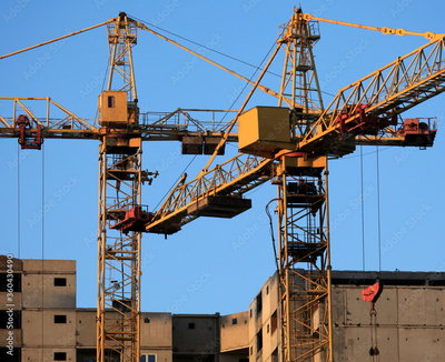 Old construction cranes at the construction of panel apartment buildings. Construction site with cranes on the blue sky background. Construction of a new housing estate