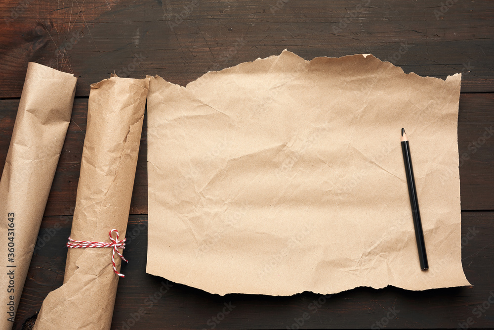 black pencil and roll of untwisted brown paper on a wooden surface from old boards