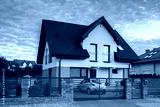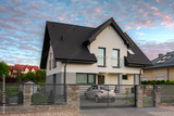 A modern single family house with a garden at sunset