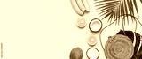 Summer fashion flat lay. Round trendy rattan bag, tropical palm leaves, coconut, orange, bananas on yellow background. Top view, copy space. Trendy bamboo bag. Creative background, vacation concept