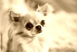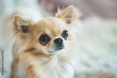 Closeup of a long-haired chihuahua with tear stains, leaving it dark around the eyes