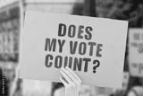 The question " Does my vote count? " on a banner in men's hand with blurred background. Presidential election. Voting. Politics. Government. Administration. Decision. Choice. Political battle