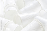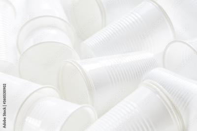 Disposable plastic cups as background. Environmental concept. Non-compostable waste