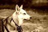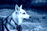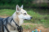 shepherd dog with a muzzle hanging on his neck