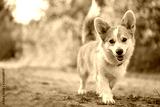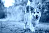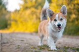 Cute Corgi dog runs and smiles. Little happy puppy on a walk