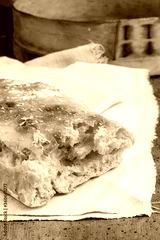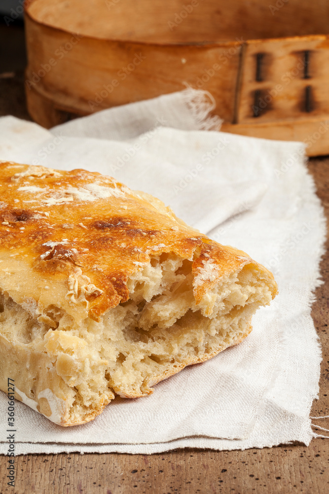 Ciabatta. Fresh italian ciabatta bread with herbs, olive oil and olives on a wooden background, top view