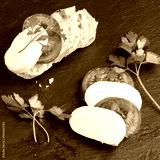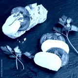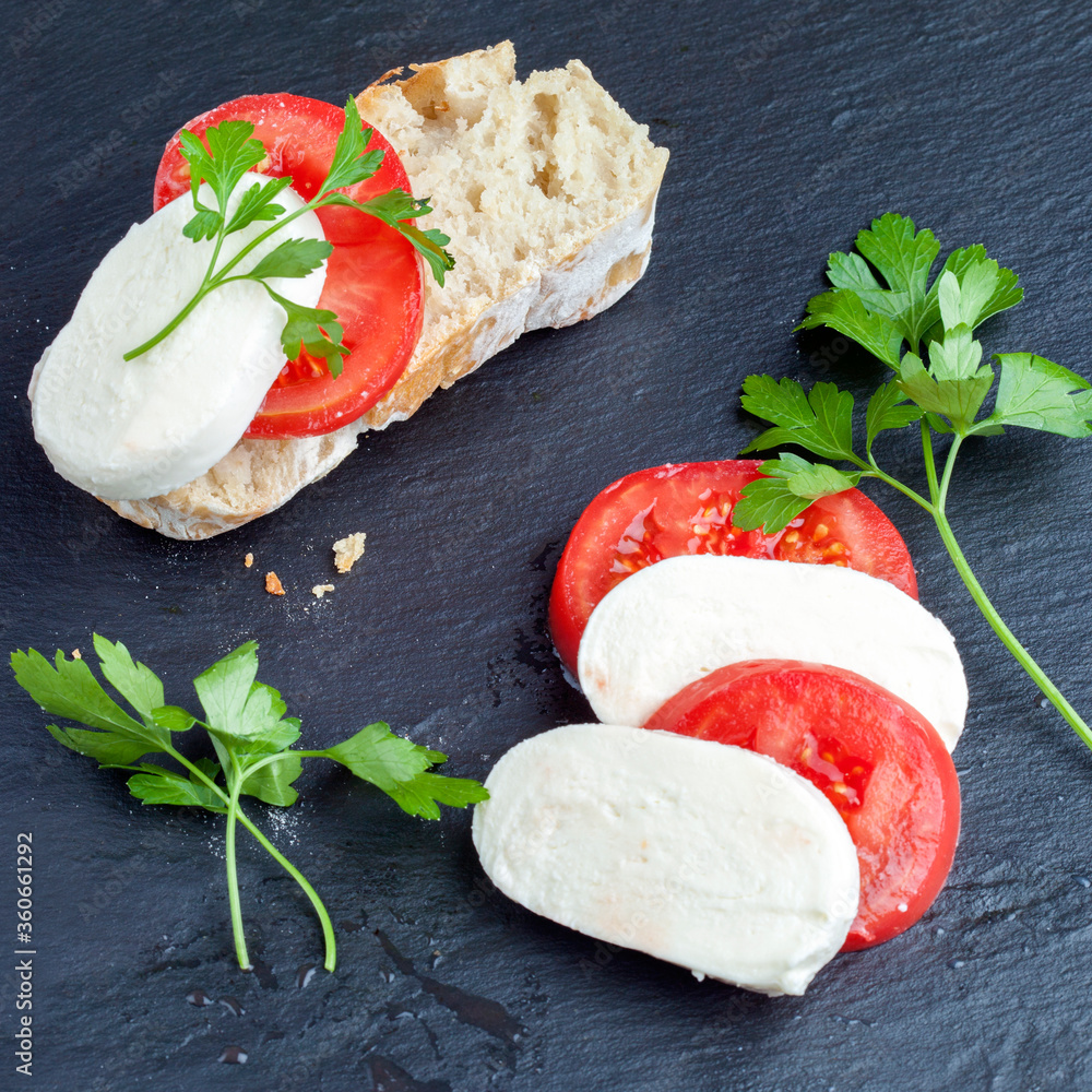 Bruschetta with tomatoes, mozzarella and basil on a cutting board. Traditional italian appetizer or antipasti appetizer. Top view with copy space.