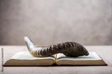 Rosh Hashanah (Hashana) (jewish New Year holiday) concept with Ram shofar (horn) with religious holy prayer book on table