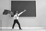 Back to school. Schoolgirl in a superhero costume on the background of a green school board in the classroom.