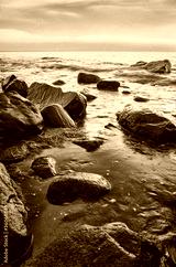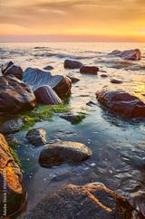 Seascape with rocks in water at sunset.