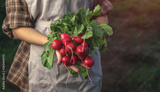 Farmers holding fresh radish in hands on farm. Woman hands holding freshly bunch harvest. Healthy organic food, vegetables, agriculture, close up