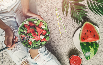 Woman in jeans eating fresh summer watermelon salad with feta cheese with smoothie on light background with tropical leaves. Healthy food, clean eating, Buddha bowl salad, top view, toning