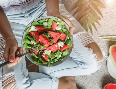 Woman in jeans eating fresh summer watermelon salad with feta cheese with smoothie on light background with tropical leaves. Healthy food, clean eating, Buddha bowl salad, top view, toning
