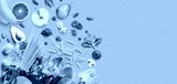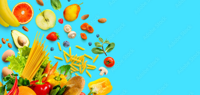 Healthy food assortment. Vegetables and fruits, groceries on aqua blue background. Copy space