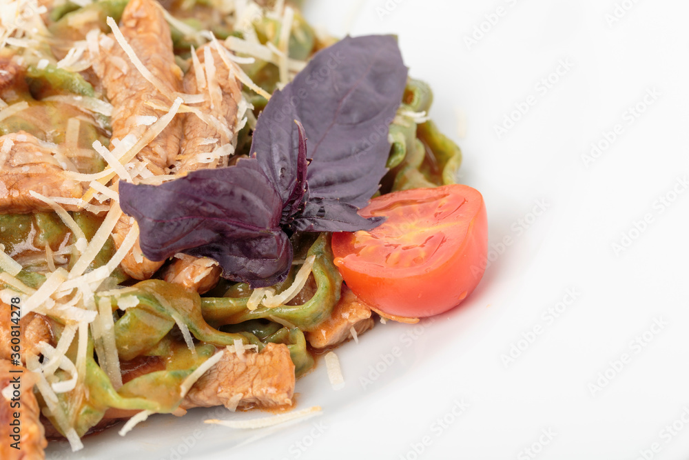 Tagliatelle spinach pasta with beaf and cheese.
