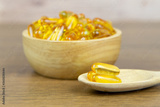 A pile of cod liver oil capsule in a wooden spoon. Dietary supplement for health-care concepts.