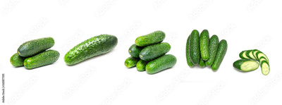 Collage. Cucumbers on a white background. Different number of cucumbers in groups. Also chopped cucumber.
