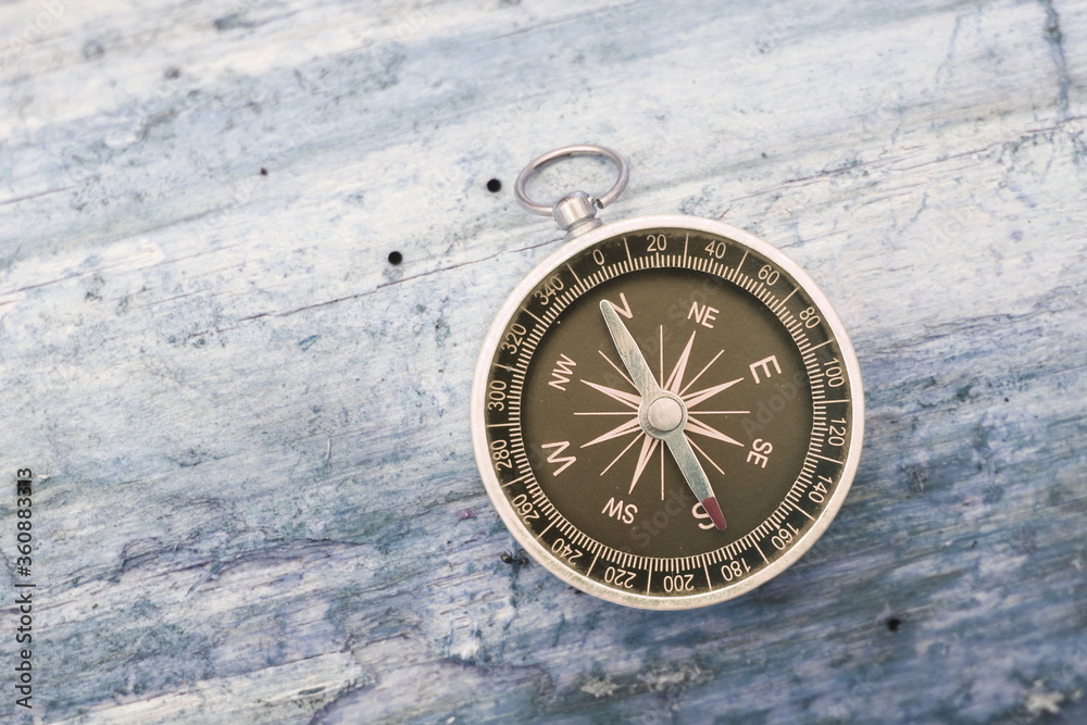 round compass on blue wooden background as symbol of tourism with compass, travel with compass and outdoor activities with compass