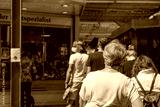Selected focus view, Group of European people queue and wait for buy food in front of stall in market during social distancing and quarantine regulations for COVID-19 virus in Düsseldorf, Germany.