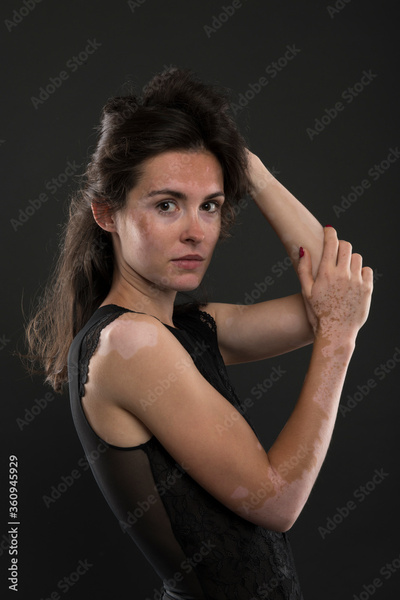 Vitiligo on the hands. Young beautiful woman with vitiligo.
