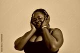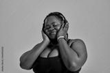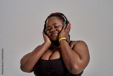 Music. Plump, plus size african american woman in sportswear and headphones listening to music, standing in studio over grey background. Concept of sport, healthy lifestyle, body positive, equality