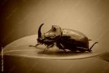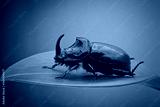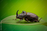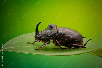 Side view of European Rhinoceros Beetle. Oryctes Nasicornis on a green leaf and flower.