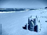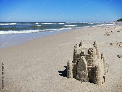Landscape shot of a beach sand castle on a sunny day
